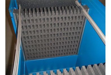 Stahlladungsträger mit Schaumeinlagen. Bauteilsicherung über die Schäume, die letzte Lage wird über den Deckel gesichert